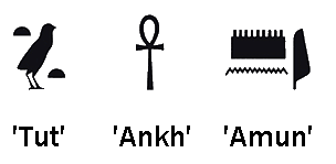 Some languages start with pictograms, but emerge later into a dual system of pictogram/phonetic graphemes that map to phonemes. The most remarkable example of this is Egyptian hieroglyphics. Thus Tut-Ankh-Amun, the name of the great Egyptian king, is represented as pictographic graphemes which map to the phonemes ‘Tut’, ‘Ankh’, ‘Amun’. which can then be read as a sequence of sounds that invoke a concept, the famous king of ancient Egypt Tutankhamun, shown below in pictographic phonemic form: