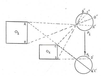 The Pick-Up of Ambient Light Gradients. As the chambered eye in the circle) moves from position P1 to P2, the displayed margins A”, B”, C”, D” are displaced across the retina at different rates. These margins are the product of object boundaries structuring ambient light. (The rectangular shapes O1 and O2 represent remote objects.) (See text page 22.){22}