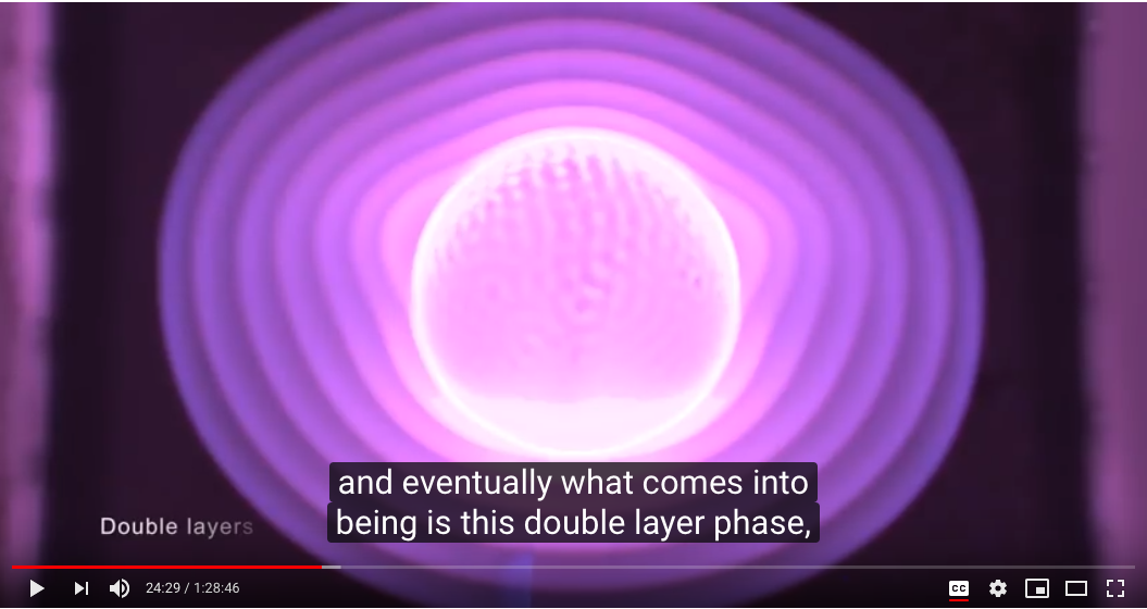 This phenomenon of plasma double layers can be experimentally created in the laboratory. I highly recommend that you see the full presentation of the SAFIRE project, captured in the video titled ‘The SAFIRE Project 2017-2018 Update‘. Here is a frame capture from that video at time 24:28 illustrating plasma spherical double layers: