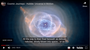 One may reasonably ask Why the electric nature of the universe took so long to discover? The answer is that the electric nature of the universe was originally a theoretical assumption formulated in the mid-nineteenth century. In those days it was not possible to directly see (e.g., through telescoping observation) the electromagnetic substance, plasma, filling much of the universe. That is because to see electromagnetic phenomena through telescopes required the use of long- and short-wavelength filters, in the infrared and ultraviolet ranges. The use of such filters, especially on extra-terrestrial telescopes (such and the Hubble and the COBE) revealed dramatically the pervasive presence of plasma substance throughout the observed universe. See, for example, the excellent YouTube video of the Hubble Telescope entitled ‘Hubble: Universe in Motion‘, and its amazing views of the cosmos. Below is a screenshot from that video, selected at time 2:40 because (although not mentioned in the video) the Hubble image captures a key concept of plasma physics: the emergence of the (nested spherical) double layer state.